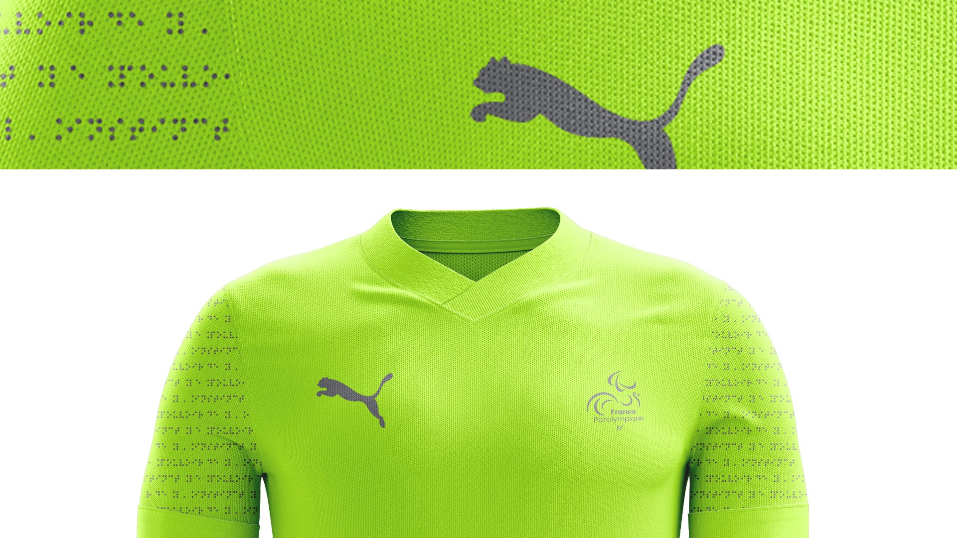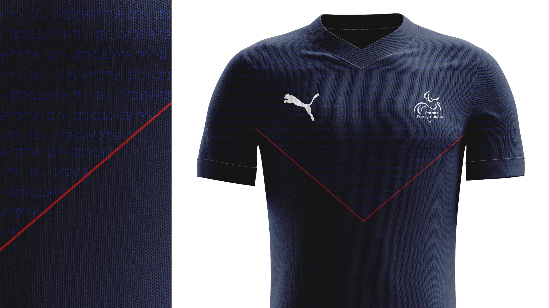 France is a country rich with contributions to the visually impaired community including the invention of braille by Louis Braille and the popularization of the white cane, by Guilly d'Herbemont. In the home and away jerseys, we featured the phase “The Power of Instinct” (“Le Pouvoir de l’Instinct”) in braille, a nod to how cecifoot players excel at using their instincts to find their teammates and the goal.